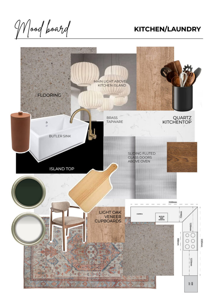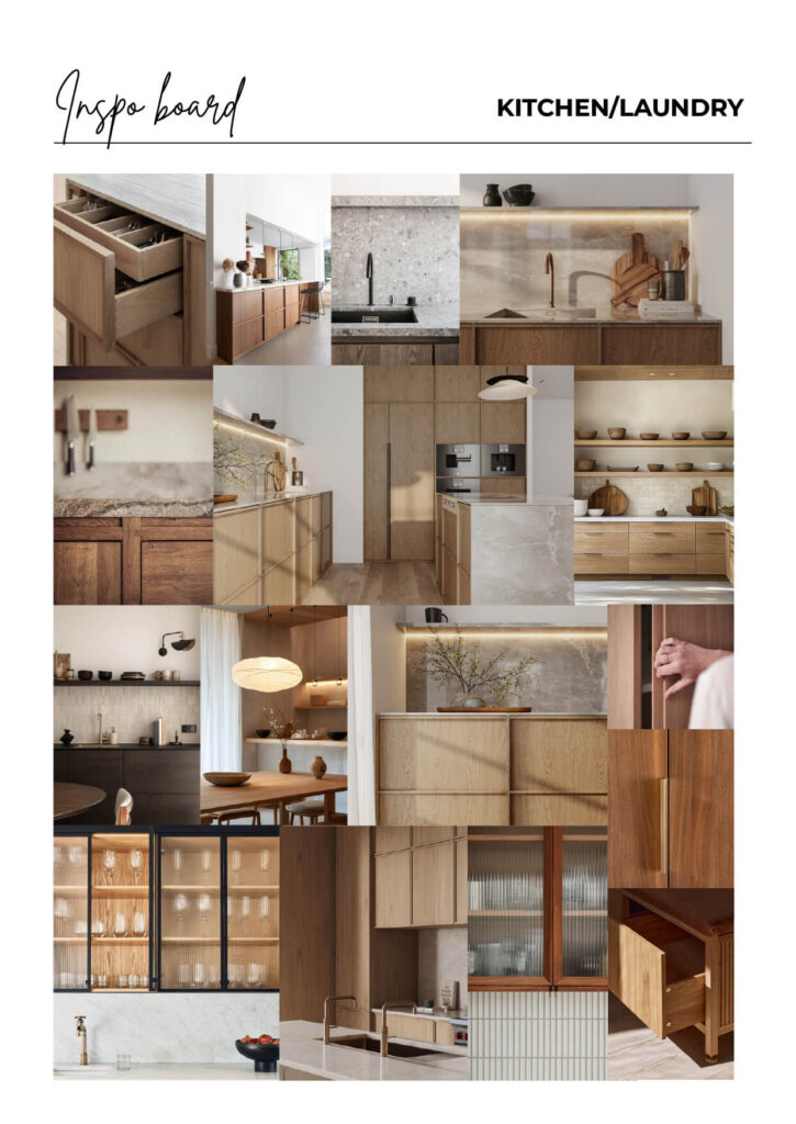 After their inspiration board, we move onto the mood board of the space they are wanting to renovate, to go into more detail the kind of furniture, colours, flooring, cupboard handle designs, textures etc