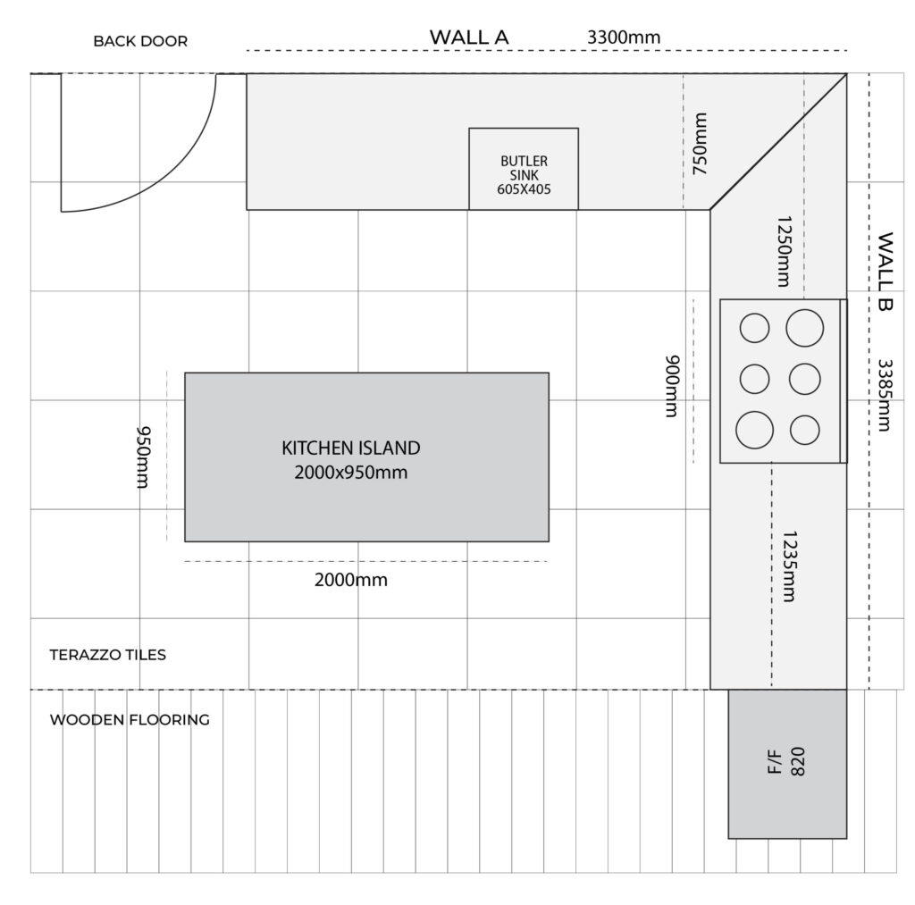 Once the client has approved the mood board, we then move on to the layout for the kitchen. We do this to scale so that once the material board is signed off, its easier to start getting quotes on the chosen items as you already have the sizes and then get the quote ready as soon as possible.