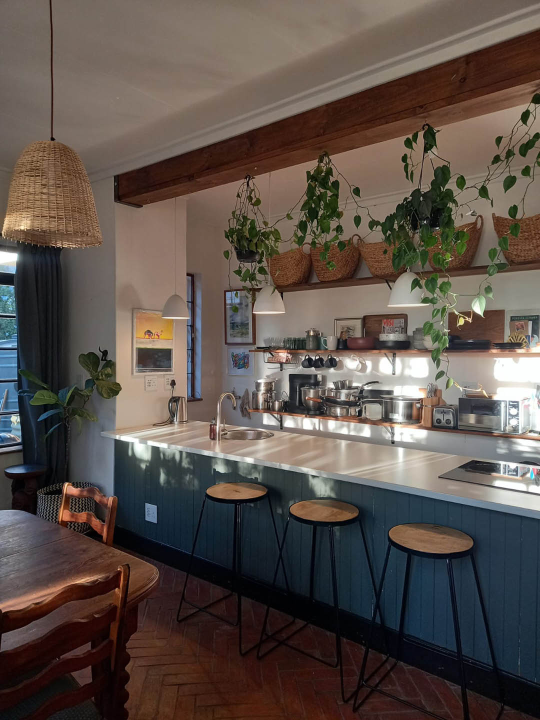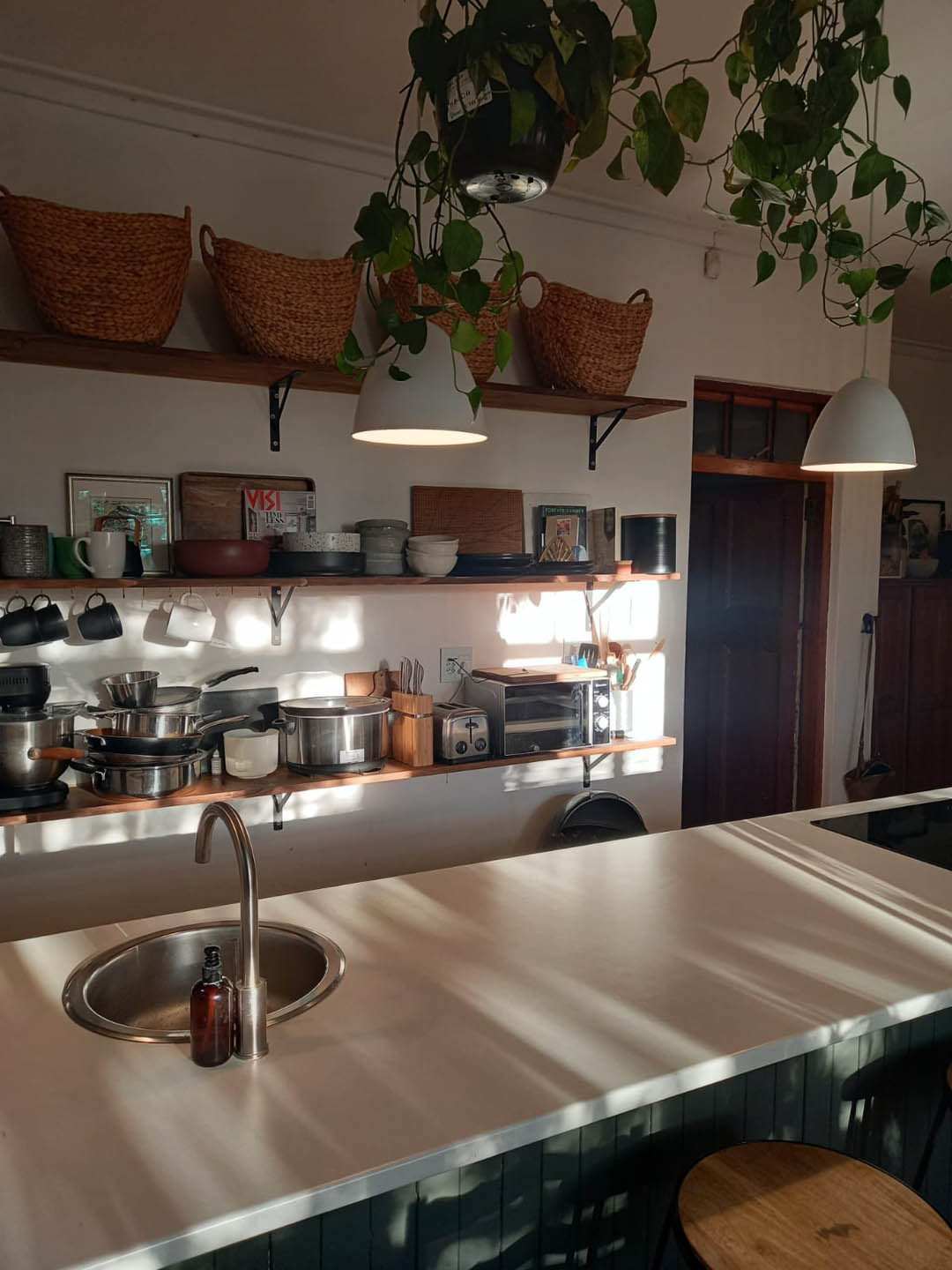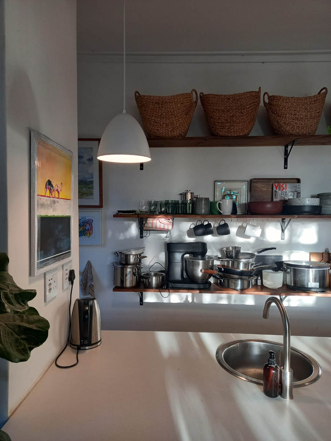 - Shelving for decorative items, hanging plants and baskets on the top shelf